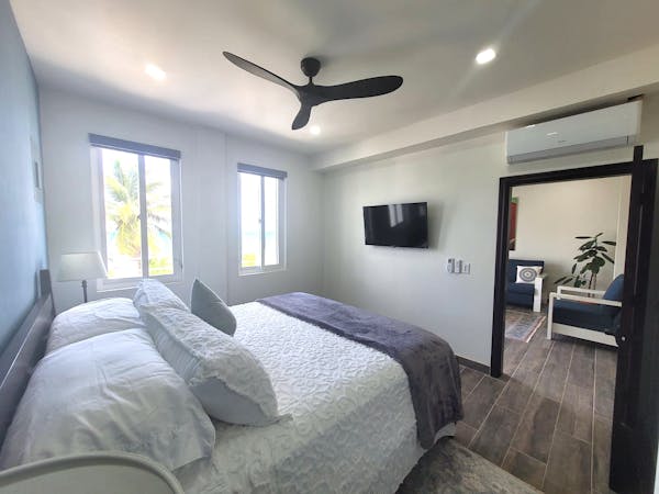This oceanfront room on the front of the property looks out on the private beach, private dock, and beautiful Caribbean sea. Luxury room with plush linens, minibar, and Smart TV. Spacious, covered, outdoor seating that is perfect for enjoying the ocean breeze and evening relaxation. Ocean view with a King size bed that sleeps up to three.