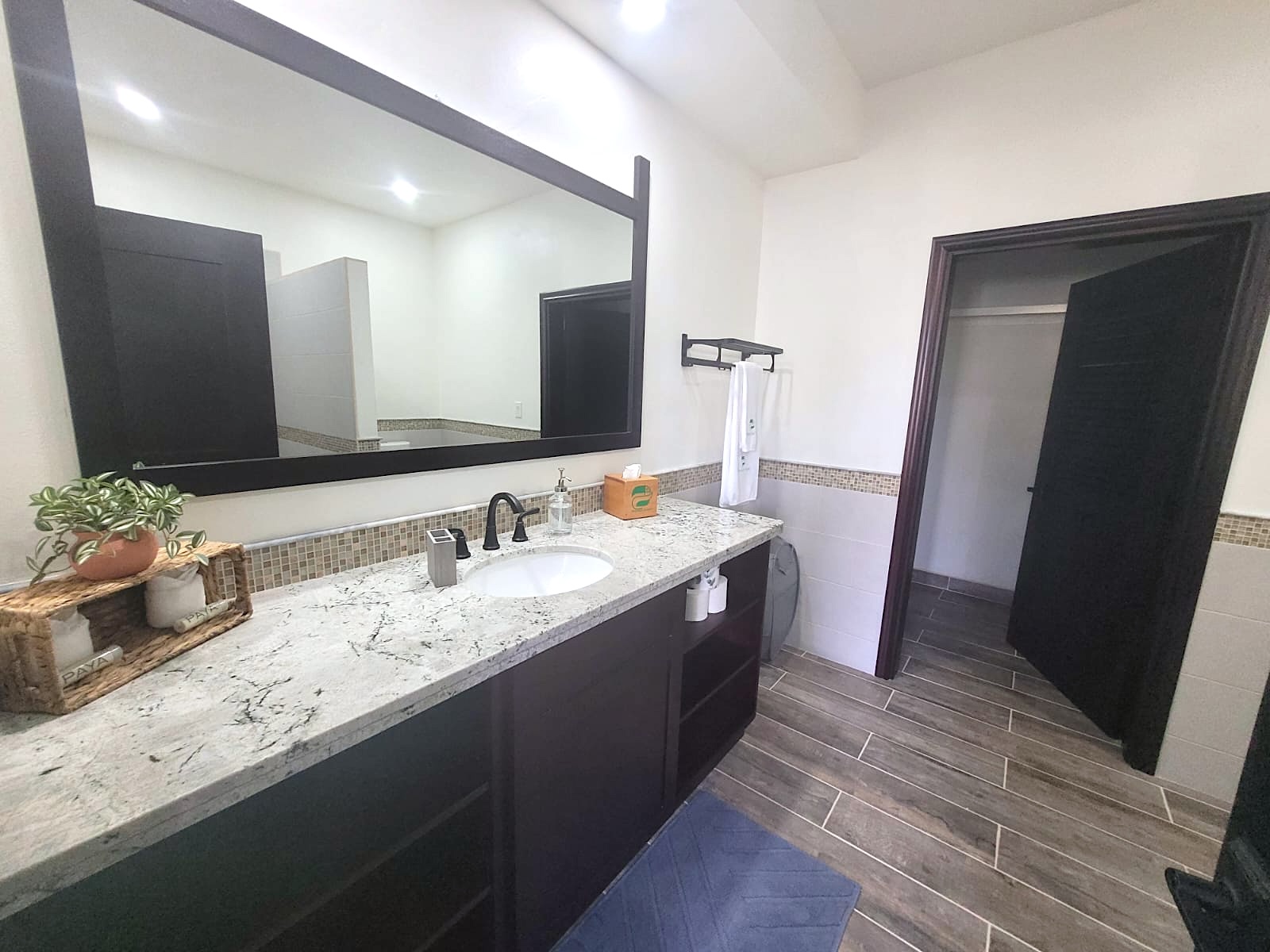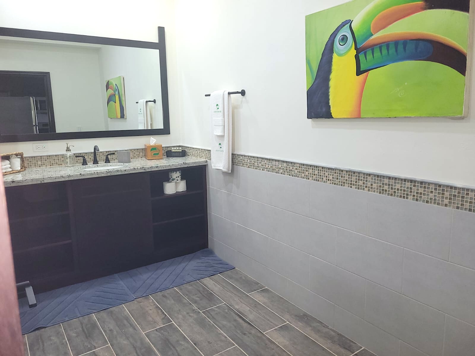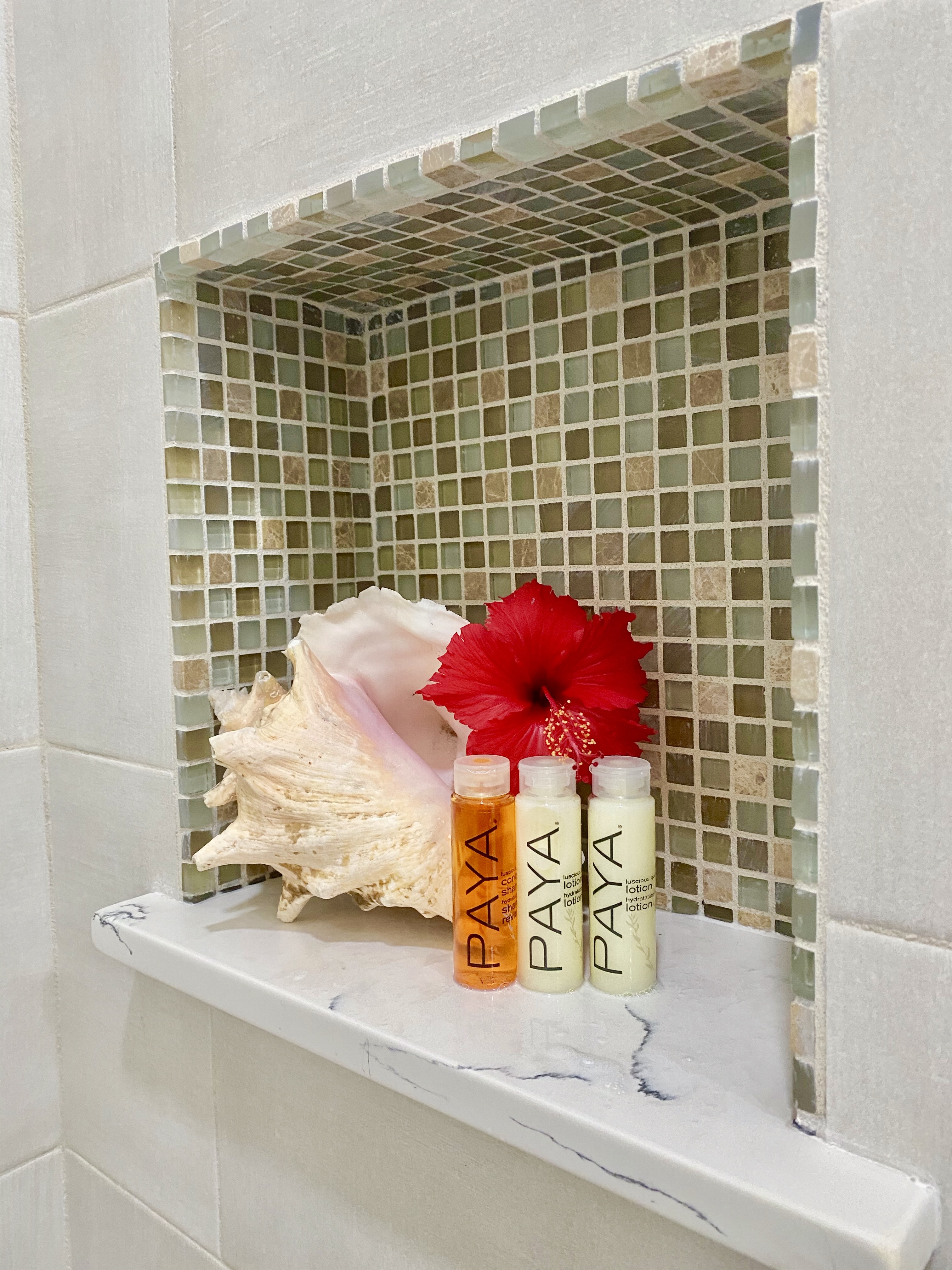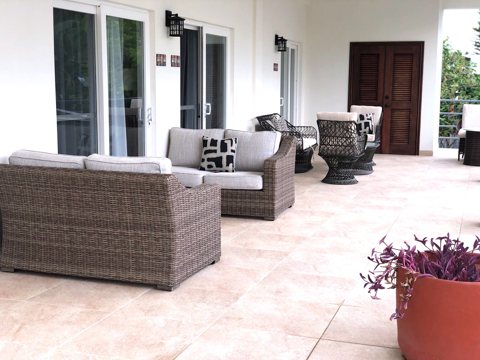 The Terrace Suite – Three Bedroom was built with luxury, relaxation, and comfort in mind. Overlooking the pool and garden areas, this luxurious suite boasts a spacious kitchen, living, and dining area. Fully equipped kitchen with state-of-the-art General Electric appliances and a butcher block island. Connected to two en-suites with private, covered, outdoor seating space. Two King beds and one Full size bed—with the ability to sleep up to seven.