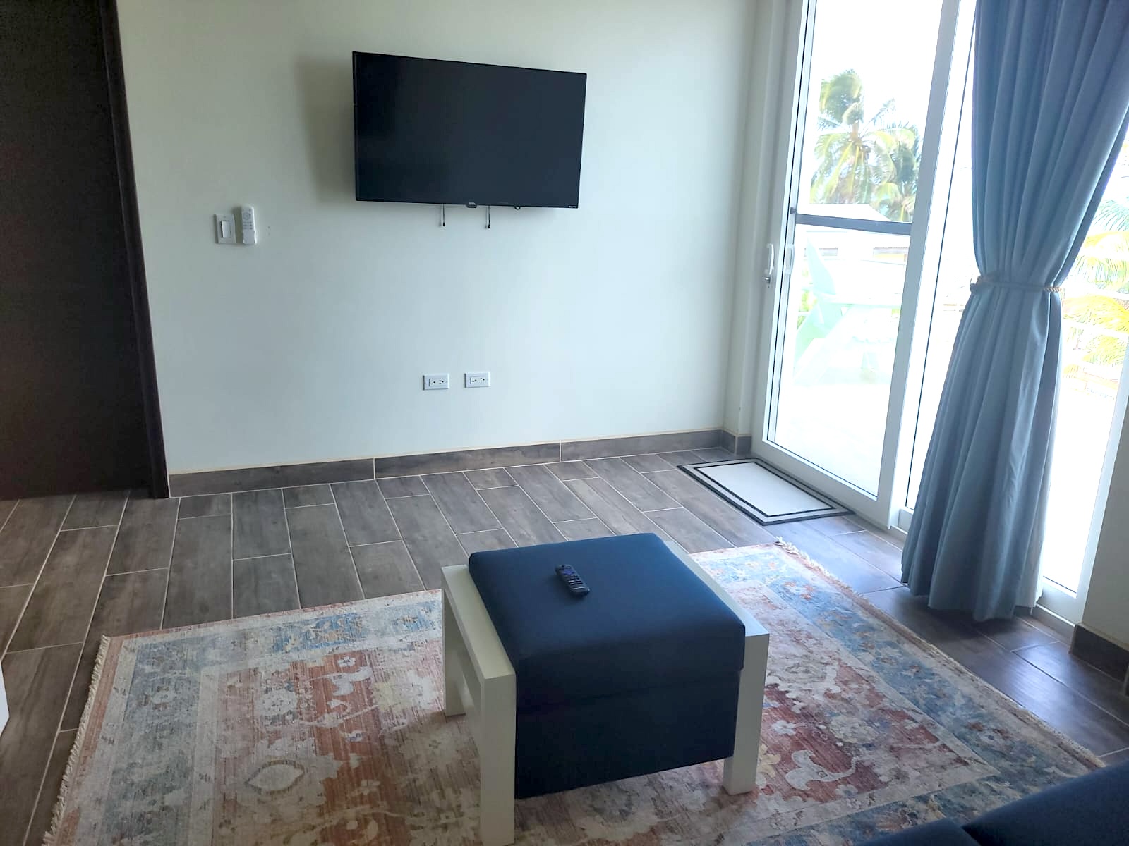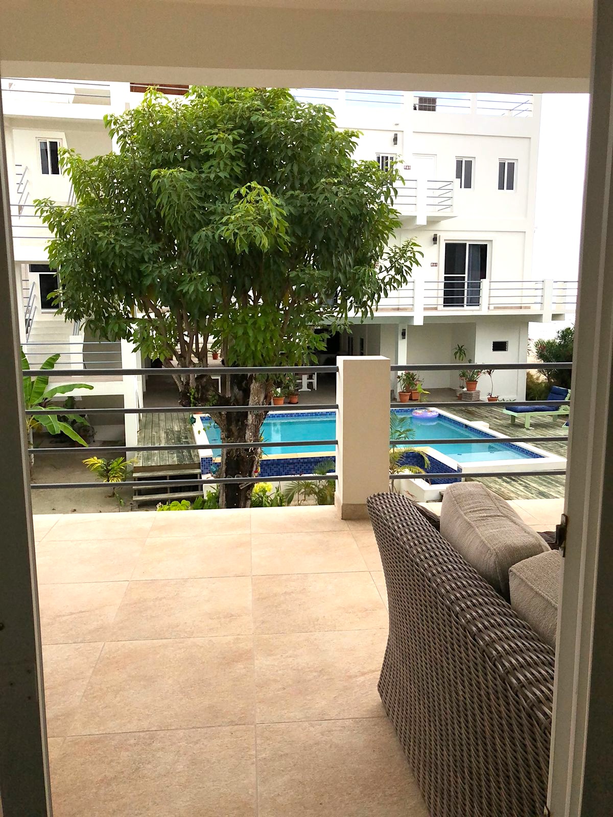 Luxury room with plush linens, minibar, and Smart TV. Spacious, covered, outdoor seating that is perfect for enjoying the ocean breeze and evening relaxation. Poolside view with a King size bed that sleeps up to three.